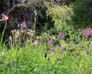 As springtime progresses while the land is still moist from winter rain, Skopelos comes alive with flowers of every colour, with the vivid reds of poppies (Papaver dubium and P. rhoeas) and bright yellow of crown daisies and corn marigolds (Glebionis coronaria and G. segetum) filling the fields and olive groves with their vibrant colours, the purple tassel hyacinths (Muscari comosum), the magenta gladioli (Gladiolus italicus & G. illyricus), beautiful blues Cynoglossum creticum and viper’s bugloss (Echium planaginium), with pinks of common centaury (Centaurium erythraea).
