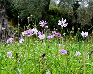 The fragrant narcissi with their nodding heads make an appearance and the fields and olive groves fill with anemones from palest to deepest pink.