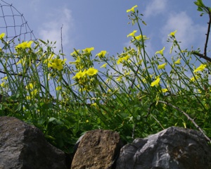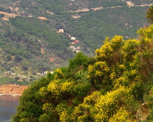As the multitudes of many-coloured spring flowers begin to fade, Skopelos evolves into its yellow phase, with a magnificent display of yellow flowered spiny shrubs on the hillsides; dominated by spanish broom (Spartium junceum); with its long terminal spines, spiny broom (Calicotome villosa), with evil thorns and the prickly bushes Anthyllis hermaniae and Genista acanthoclada. Bladder senna (Colutea arborescence) with its curious seed pods and tree medic (Medicago arborea) brightens the slopes of the kastro. In May many of the fields are filled with yellow mustard flowers, often difficult to identify with accuracy.