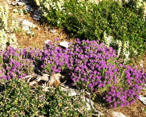 As temperatures rise, the aromatic herbs, thymes, sages, summer savoury and other spiny shrubs dominate the island; they exhibit features which allow them to withstand high temperatures, a paucity of moisture and prolonged exposure to high intensity of light, which would make other plants wilt or die. This is also the season of Greek thistles, some purple and some yellow, but all prickly. By mid summer, the fields are burnished with dried grasses but the flowers of wild carrot (Daucus carrota) appear as a white foam in olive groves and will persist into August providing fodder for animals.