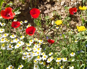 By late spring there are too many flowers to name, it is as if the plants are tumbling over each other in their haste to flower and produce seeds before the hot dry summer months set in. These are the months of orchids, - pyramidal orchids (Anacamtis pyramidalis), and the reddish brown bug orchids are abundant and hidden amongst the green sward, are the more elusive bee orchids, subtle and sophisticated (Ophry apifera & O. bombyliflora).