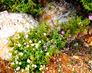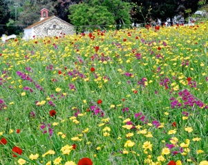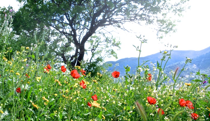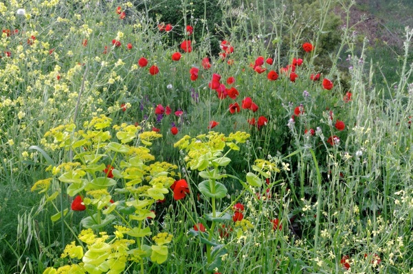 Flowers of many colours too numerous to list, fill the fields, border the roadside verges and brighten the forest clearings. At an early phase of the season the fields and olive groves dominated by yellow are quickly joined by the brilliant red of poppies, pink mallows and magenta of wild gladioli, against a succulent background of fresh green. The colours if put together by humans would appear to clash, but nature blends them beautifully.