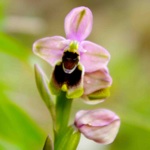 This beautiful orchid, Ophrys tenthendifera, was found in isolation under the shade of a stone wall, but in some years it appears in larger numbers. Like many of the ophrys orchids, it is named after the insect it has evolved to attract, in this case the sawfly. A neat slim orchid with pink petals have a central green line. The lip has distinctive deep brown markings on a bright green background which looks like a winged insect.