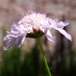 The pale purplish-pink heads of Scabiosa atropurpurea can be seen along the roadside, waving even in the gentlest breeze at the top of straight thin stems. Careful inspection reveals that these are not single flowers but a crowded collection of tiny florets. The central florets are tubular and these are surrounded by asymmetrical flowers of larger fuse petals giving the whole a lacy appearance.