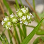 An inconspicuous little plant, which is easily overlooked where it grows amongst the grasses, Valerianella discoides is one of a number of related plants with the English name of corn salad. Its young leaves can be eaten by humans and apparently are enjoyed by tortoises. The flowers tiny petals are palest pink, surrounded by green toothed calyx; they are arranged in globular heads