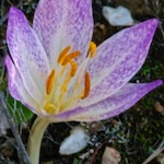 The beautiful, impressive, delicate flowers of Colchicum bivonae appear in autumn after the first rains. The translucent white tepals are chequered with pale purple surround 6 bright yellow stamens, and 3 curved white styles. The tepals fuse to form a white tube, which emerges directly from the earth. The leaves do not appear until spring.