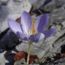 Flowering in autumn, the delicate crocuses Crocus cancellatus are found hiding amongst the rocks around Sendoukia. The translucent tepals vary in colour from pale mauve to violet, and often having 3 darker lines on the outer surface, the centre is pale yellow. The stigma is bright yellow with 3 finely divided branches, the stamens are also yellow.