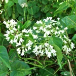Usually found on the edge of fields, scrambling through fences or brushwood, Cionura erecta has waxy green, heart shaped leaves and clusters of small white flowers. The flowers have an unpleasant smell and the whole plant is poisonous but it has been found to contain substances damaging to malarial mosquitos. The fruits are long green pods which resemble chilly peppers.
