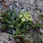 The succulent Crithmum maritimum is a plant of coastal rocks, growing on shingle beaches and in rocky crevices of tall cliffs. The branched stems are fleshy but woody at the base with thick grey-green leaves which have 3 to 7 narrow lobes. The flower are arranged in umbels with 8 to 16 thick spokes supporting 12 to 20 small white flowers which are short lived quickly developing into green seeds which eventually turn purple. The plant are resistant to the salty spray of the sea and only grow in close proximity to the shore.