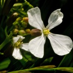 The flowers are similar to wild radish (Raphanus raphinastrum) but can be differentiated by the leaves, which have narrower segments and the calyx of the flower which is fuller and has been described as bladder-like. The flowers can be pale yellow as well as white. The plant is sometimes referred to as the caterpillar plant, the reason for this is uncertain as they are not particularly favoured by caterpillars, perhaps they are too bitter, but the leaves often have holes, nibbled by flee beetles.