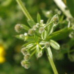 As its name suggests false cleavers (Galium spurium) is very similar to cleavers (G. aparine) but on careful inspection it appears less robust and less spiky, with fewer, shorter hairs that are somewhat softer.