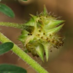 Named after an ancient military device, the common weed, caltrop (Tribulus terretris) forms spreading green mats of tangled stems; it has simple yellow flowers which are followed by fruits with sharp pointed spines. The seeds penetrate the soles of shoes (and feet) and tyres and is sometimes referred to as puncture weed.