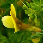 A yellow pea plant found scrambling through the grass or amongst the spiny plants of the phrygana in late spring and early summer. The leaves have 3-4 oval opposite leaflets with the terminal leaflet modified into a curly tendril. Leaves and stems are covered in hairs and the lemon yellow flowers are characteristically hairy on the outer surface of the vertical upper petal (the standard). The pods when they develop are also hairy.