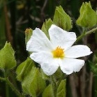 The white flowered rock rose, Cistus monspeliensis, is less common Skopelos than Cistus salvifolia; although the flowers, with their white petals and numerous yellow stamens are very similar, it is distinguished by the narrow leaves; it tends to flower a little later, with some blooms remaining until June.